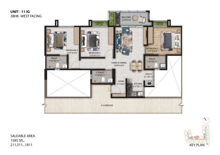 Living, Dining, Kitchen, Bedrooms – Vitrified Tiles.